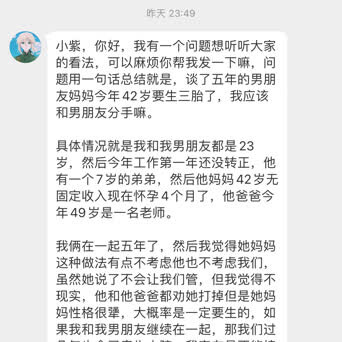 【小紫,你好,我有一个问题想听听大家的看法,可以麻烦你帮我发一下嘛,问题用一句话总结就是,谈了五年的男朋友妈妈今年42岁要生三胎了,我应该和男朋友分手嘛。